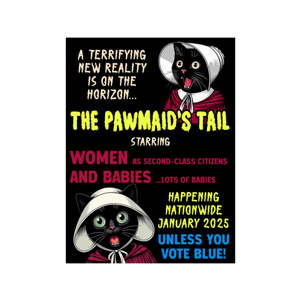 This sticker design is based on a terrifying tale: Margaret Atwood’s The Handmaid’s Tale. We updated the general idea for present times and put a cat-themed spin on it, and so The Pawmaid’s Tail was born.